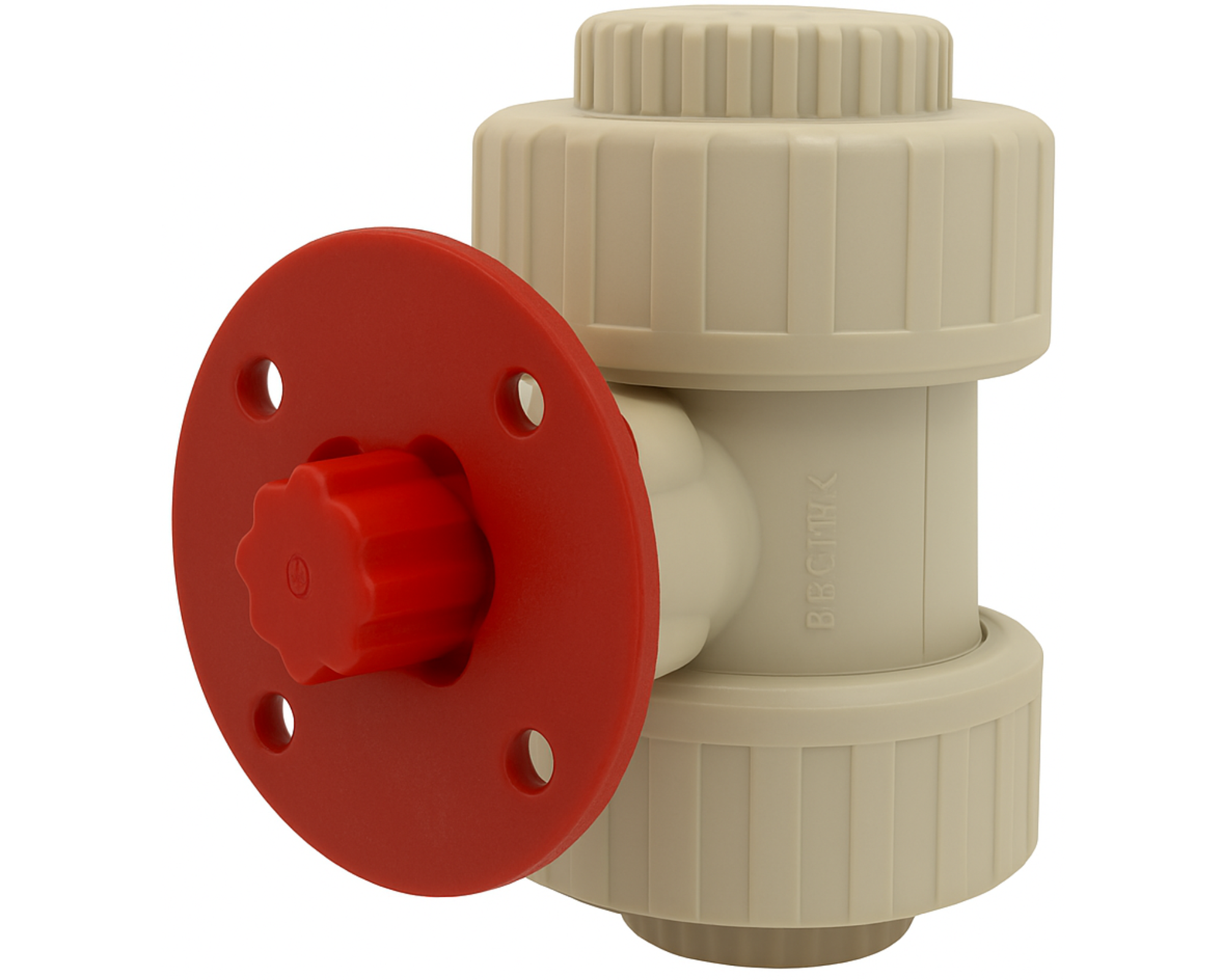 Corpo em Polipropileno Homopolímero (PP-H): O corpo da válvula é construído em PP-H, um termoplástico de engenharia com excepcional resistência a uma ampla gama de produtos químicos, incluindo ácidos, bases e soluções salinas, garantindo longa vida útil em ambientes agressivos.